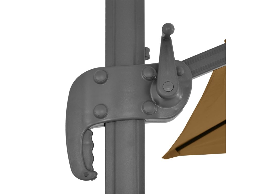 Ochranný kryt slunečníku je vyroben z polyesteru s UV ochranou a odolností proti blednutí, poskytuje vám optimální ochranu před sluncem a snadno se čistí. Má pevnou křížovou základnu pro větší stabilitu. Náš zahradní slunečník lze snadno otevřít a zavřít pouhým otočením knoflíku na tyči. Úhel krytu lze nastavit stisknutím a zatažením rukojeti nahoru a dolů. Střední tyč lze také otáčet o 360 stupňů pomocí pedálu. Silná práškově lakovaná hliníková tyč spolu s 8 odolnými žebry činí tento slunečník velmi stabilním a odolným. Montáž je snadná.