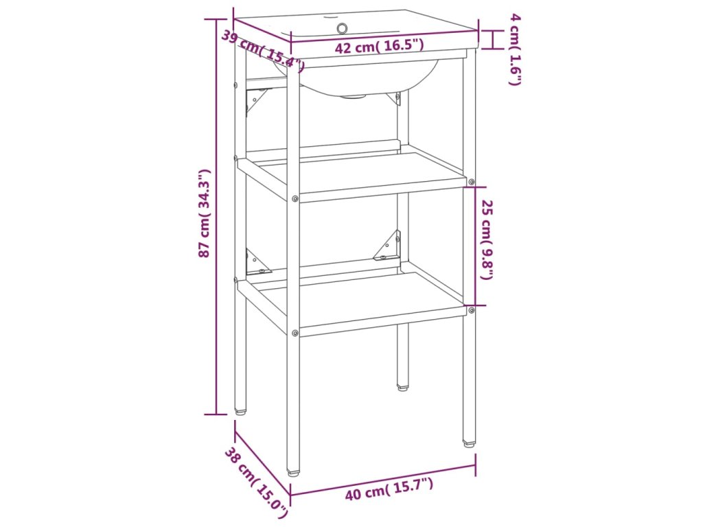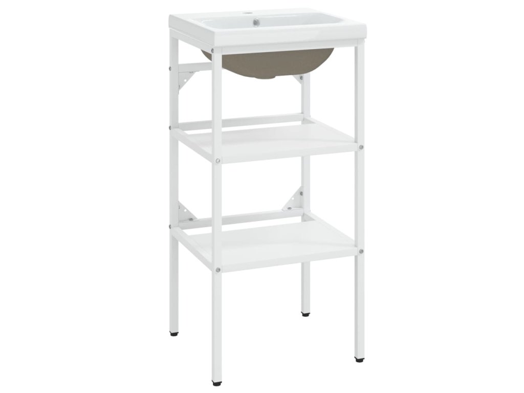 Stojan je vyroben z práškově lakovaného železa, takže je stabilní a odolný. Tento umyvadlový rám umožňuje snadný přístup k ručníkům a košíčkům a nabízí větší úložný prostor než uzavřené skříňky. Keramické umyvadlo je kromě praktického využití také ozdobou vašeho obytného prostoru. Se svým moderním designem se toto umyvadlo hodí do každého interiéru. Je vybavené přepadem pro odtékání vody a jeho glazovaný povrch přináší moderní a elegantní design. Rám i umyvadlo se navíc snadno čistí vlhkým hadříkem.