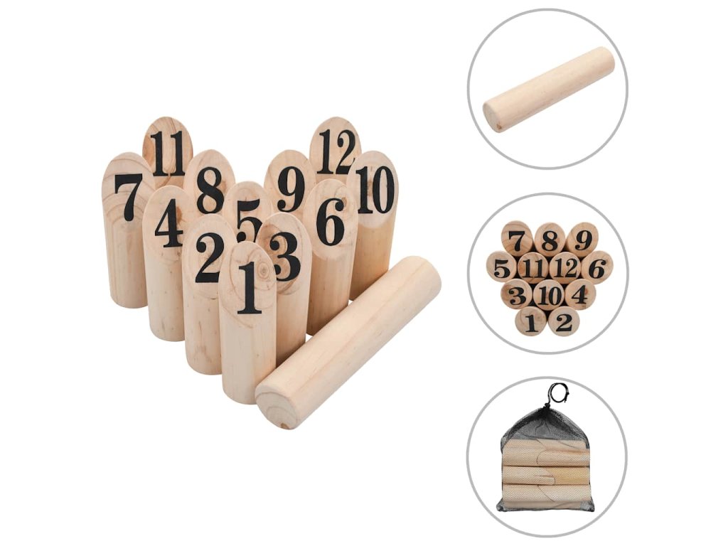 Balení obsahuje 12 očíslovaných kubbů, 1 házecí kolík a 1 přenosnou tašku.