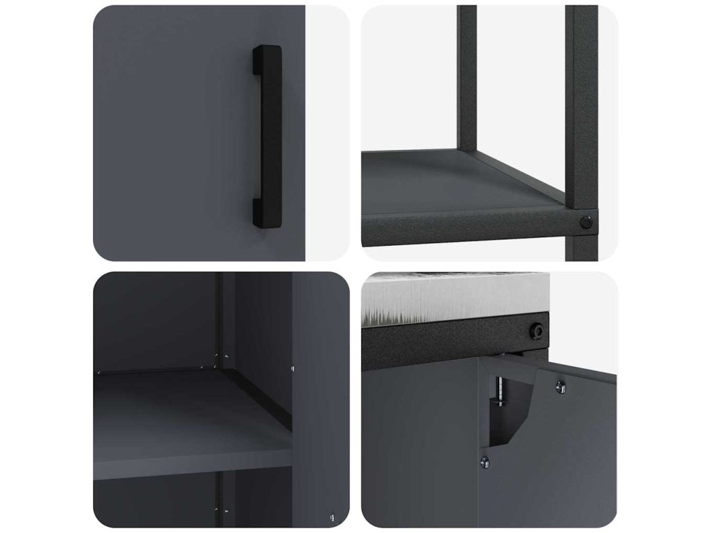 - Pevná ocelová konstrukce: Tato úložná skříňka je z robustní oceli a má minimalistickou strukturu – skvělý pro styl i trvanlivost. Udrží slušnej objem váhy a pomůže vám skladovat různý spotřebiče, nádobí a potraviny. Černý povrch jí dodává sofistikovaný vzhled, co se hodí do moderního interiéru.