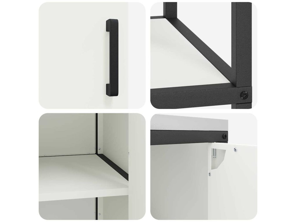 - Praktická estetika: Moderní vzhled skříňky se hodí do jakéhokoli interiéru. Její elegantní design s matnými úchyty dodává prostoru sofistikovaný nádech.