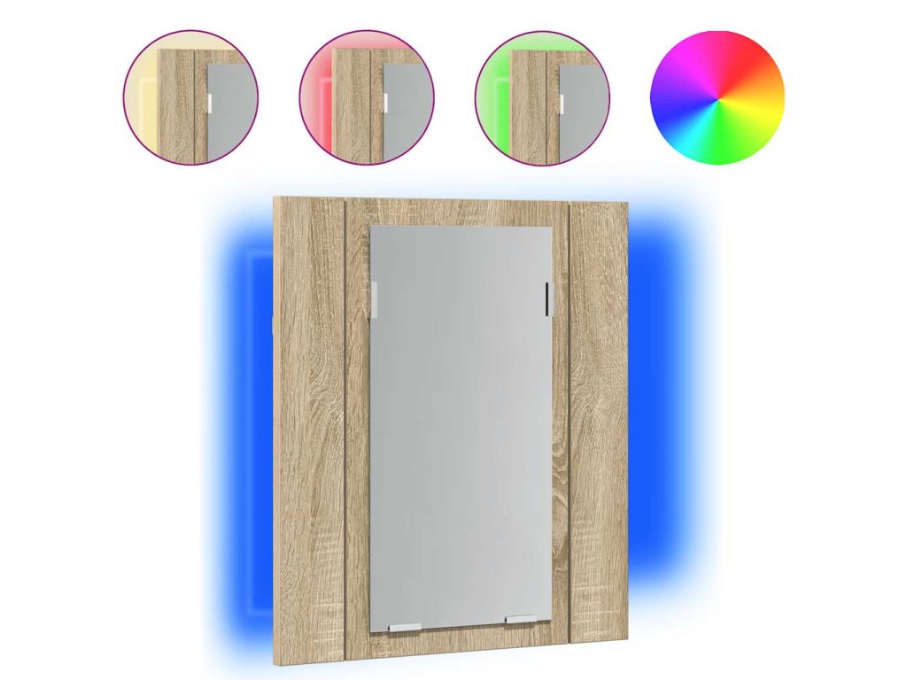 Tato koupelnová skříňka je vybavená RGB světly, takže je možné měnit barvu LED světel. Dvě police uvnitř skříňky nabízejí spoustu úložného prostoru v koupelně. Pohodlně se do nich vejdou vaše základní hygienické a toaletní potřeby jako mýdla, šampony, zubní pasty atd. Navíc se snadno čistí vlhkým hadříkem.