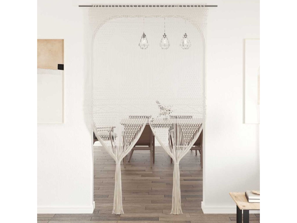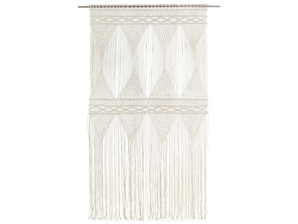 Náš praktický provázkový závěs s macramé představuje skvělý způsob, jak si zkrášlit interiér. Uplatnit ho můžete jako závěs do dveří nebo na okno, jako předěl pokoje či jako pozadí do výlohy.
