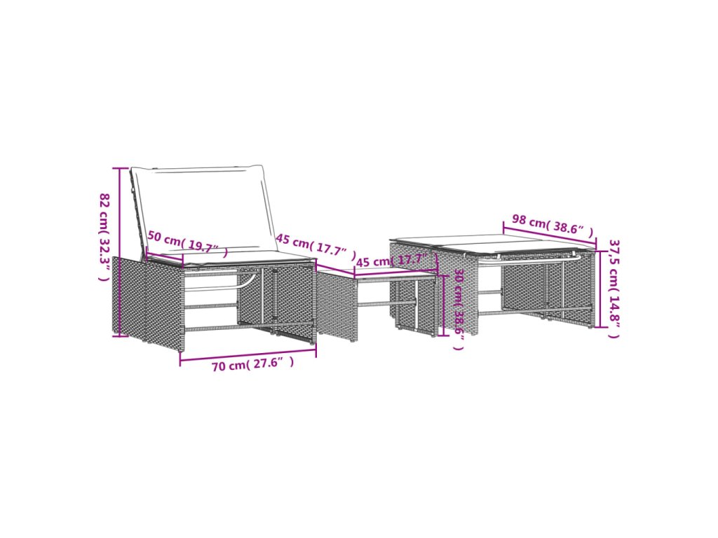 - Rozměry každého modulárního lehátka: 70 x 98 x 40/57/71/82 cm (Š x H x V)
