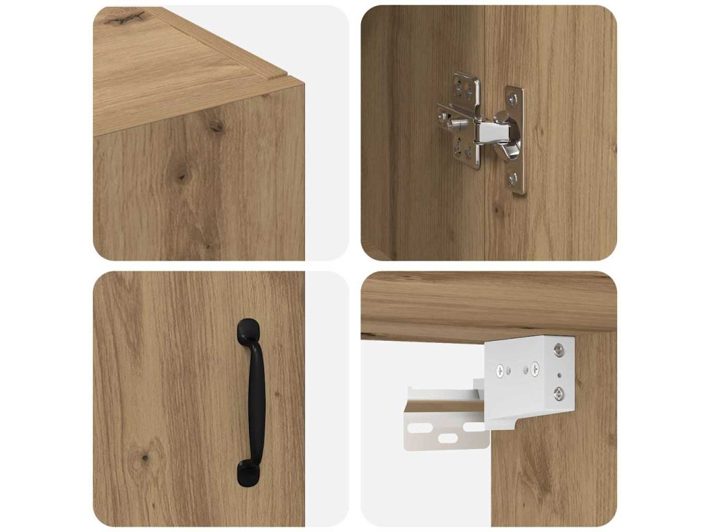 - Materiály: Tohle všechno je vyrobeno z odolného kompozitního dřeva, které vypadá skvěle a zajišťuje dlouhou životnost. Materiál dodává skříni elegantní vzhled, který se skvěle hodí do moderních interiérů. Rám odolný prohnutí zajišťuje pevnou a stabilní konstrukci, ideální pro dynamické obytné prostory.