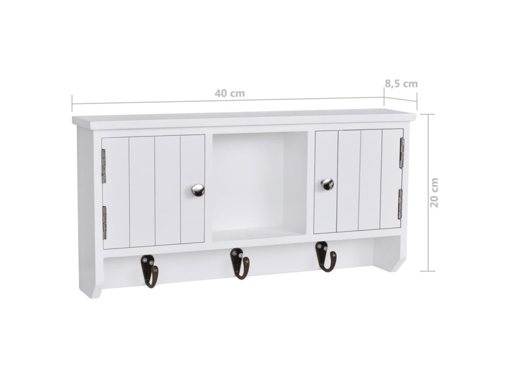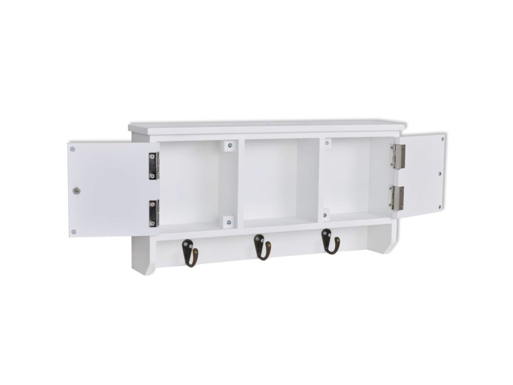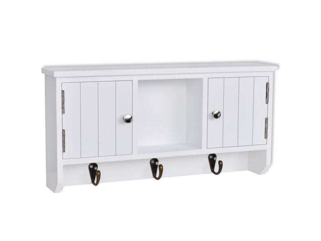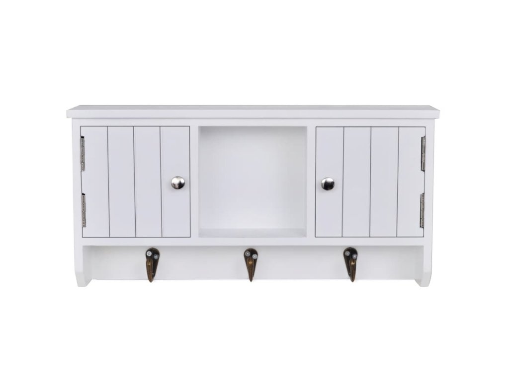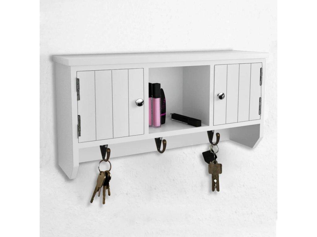 Nástěnná skříňka je opatřena třemi kovovými háčky pro zavěšení klíčů. Dvě přihrádky s dvířky a středová police poskytují dostatek prostoru pro uložení peněženek, mobilních telefonů, slunečních brýlí, šperků nebo jiných doplňků.