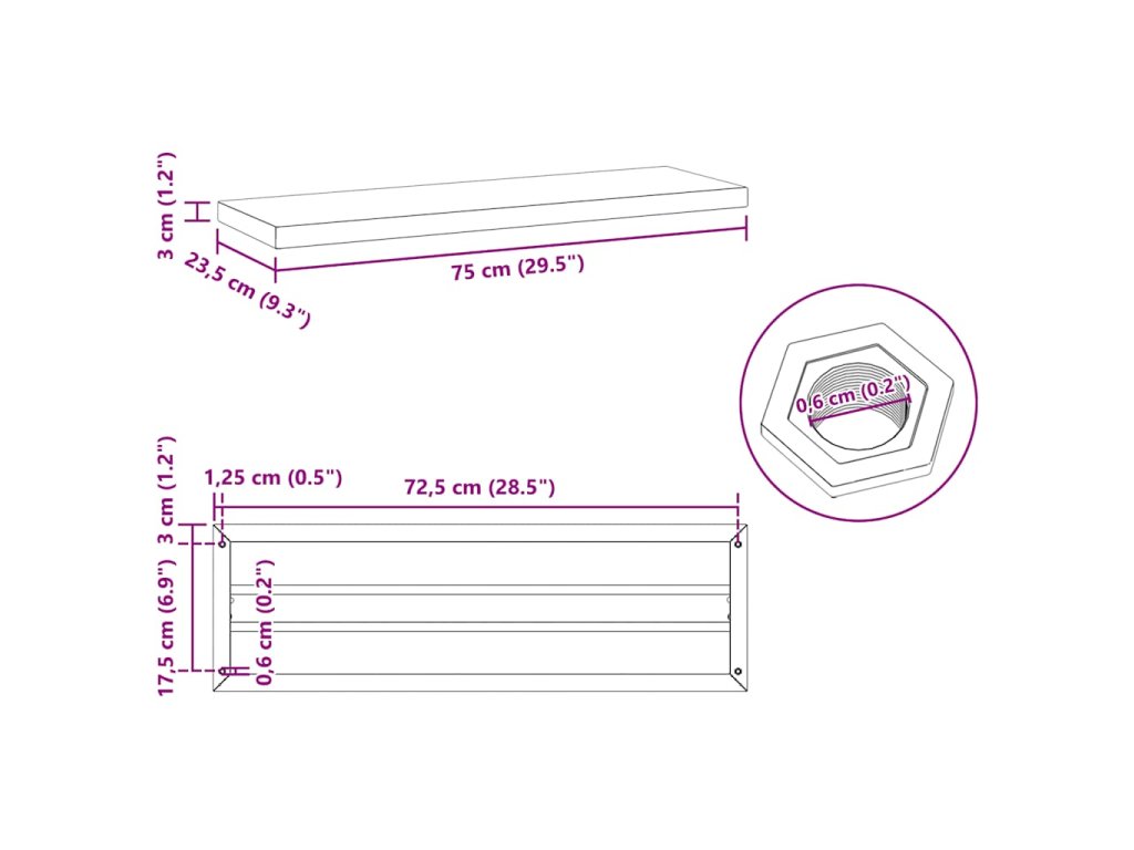 - Rozměry: 75 x 23,5 x 3 cm (D x Š x T)