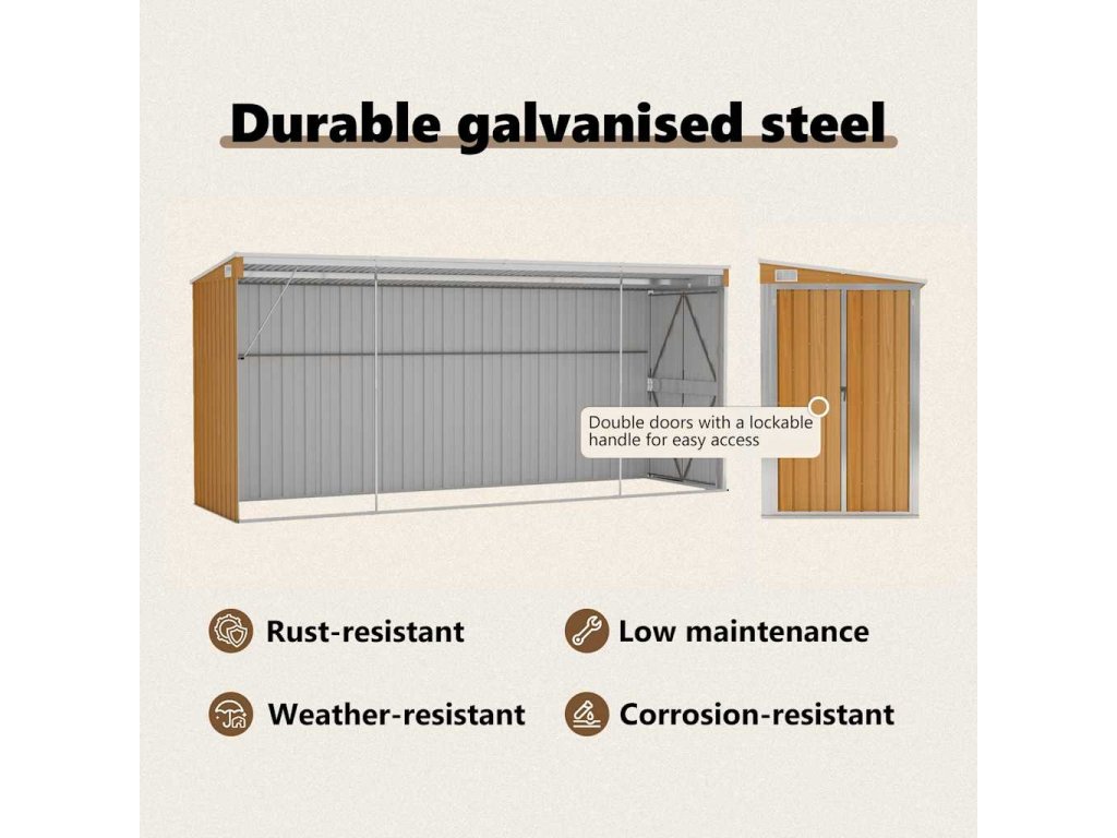 Díky tomu, že je vyroben z pozinkované oceli a kovu, vyžaduje sklad minimální údržbu a je velmi odolný. Dvojité otevírací dveře v přední části umožňují snadný vstup a výstup. Plastová rukojeť s funkcí zámku zajišťuje bezpečnost vašich věcí. Navíc dešťová voda automaticky odtéká ze střechy díky šikmé konstrukci.