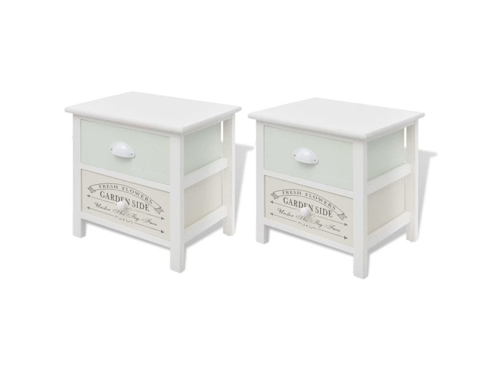 Tyto kompaktní noční stolky mají 2 hladce vysouvatelné šuplíky, které poskytují dostatek místa na vaše drobnosti, abyste je měli uspořádané a po ruce. Zásuvky s potisky ve vintage venkovském stylu dodávají stolkům rustikální ráz. Šuplíky se dají mezi sebou vyměňovat. Protože jsou vyrobené z vysoce kvalitních materiálů, jsou tyto stolky odolné a snadno se čistí.