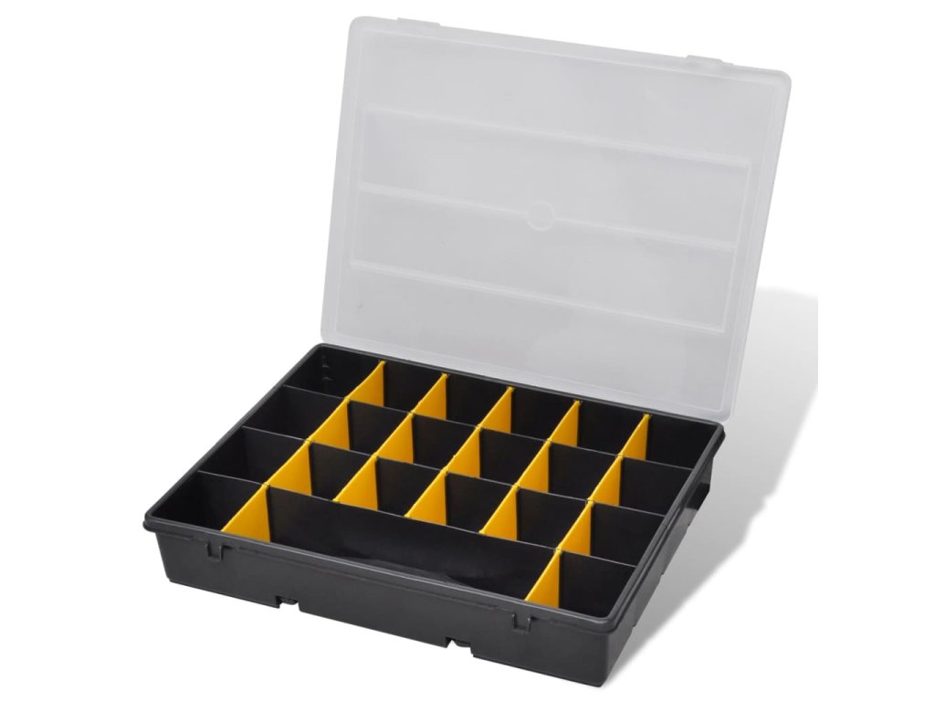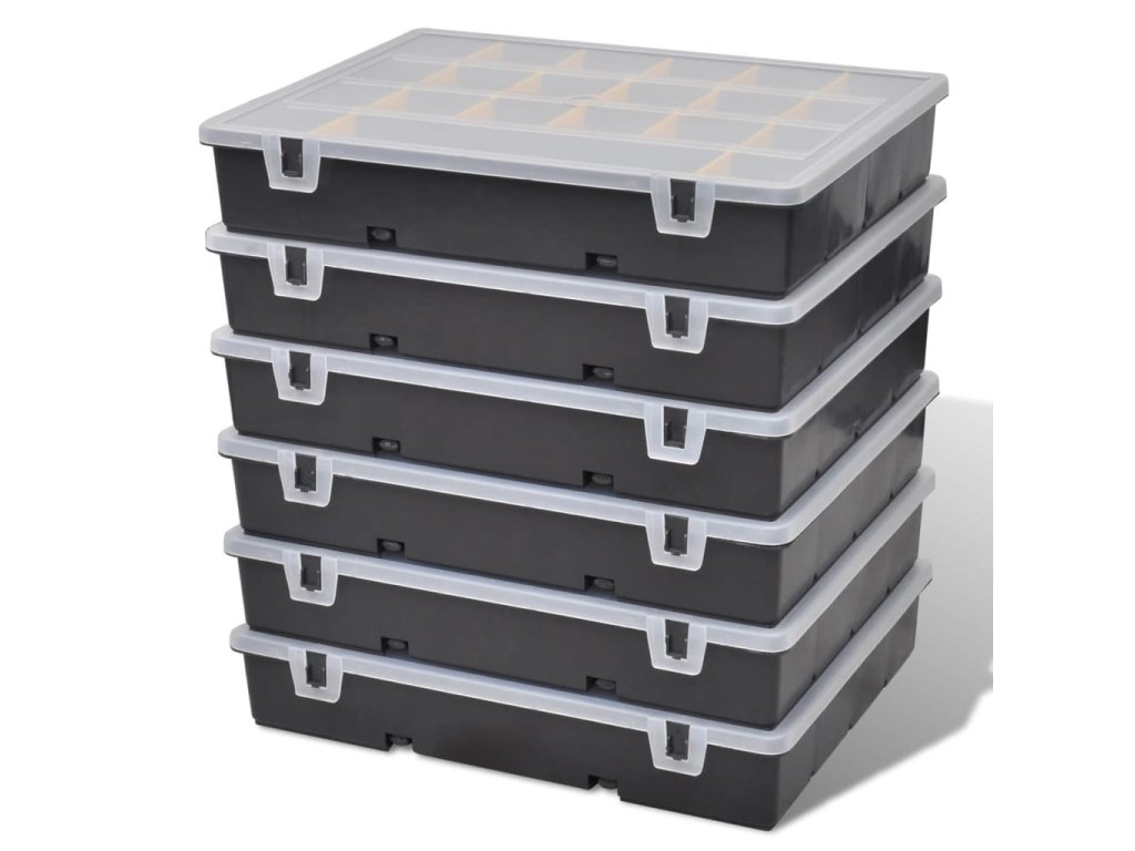 Robustní plastová sada boxů na nářadí se skládá ze 6 kusů a je ideálním pomocníkem na odkládání šroubů , matic a jiných drobných pomůcek . Každý box má 21 částí , které vám pomohou udržet pořádek v drobnostech a zajistit jejich pohodlné používání . Sada je vyrobena z kvalitního polypropylenu , má vysokou tepelnou odolnost , je odolná vůči rzi a trvanlivá. Díky madlu je box přenosný . Bude vynikajícím pomocníkem jak si uspořádat vaše pomůcky . Dodáváme 6 ks boxů na nářadí .