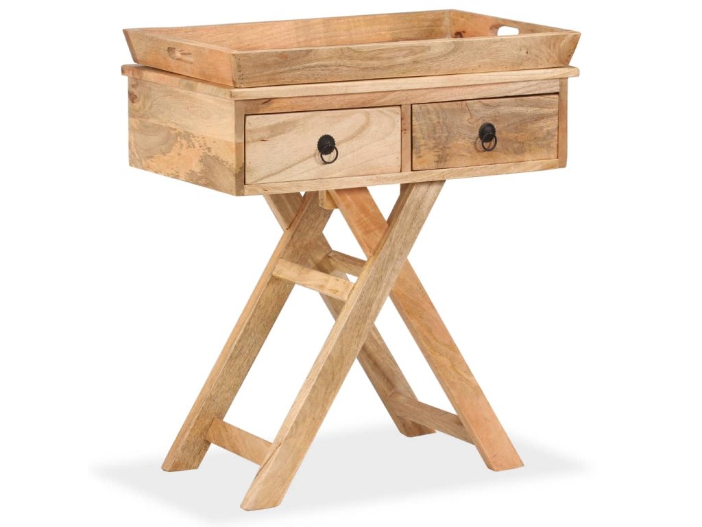 Odkládací stolek je ručně zhotoven z mangovníkového dřeva, které je nejen pevné, stabilní a odolné, ale zároveň také krásně vypadá. Zručné řemeslné zpracování přispívá k jeho okázalému retro stylu. Každá fáze výrobního procesu je prováděna s největší pečlivostí, ať už se jedná o leštění, natírání anebo lakování. Řemeslné zpracování a překrásná kresba dřeva činí každý kus nábytku unikátní a lehce odlišný od ostatních. Stolní deska je současně velký servírovací podnos, který lze snadno sejmout a v případě potřeby používat samostatně. Poskytuje také spoustu prostoru k pokládání nápojů nebo k vystavování dekorativních předmětů, jako jsou košíky s ovocem nebo vázy. Design stolku disponuje dvěma zásuvkami, kde si můžete přehledně uspořádat své menší předměty tak, abyste je měli po ruce. Nohy ve tvaru X přispívají ke stabilitě stolku a zároveň umocňují jeho úchvatný retro vzhled. Montáž je snadná.