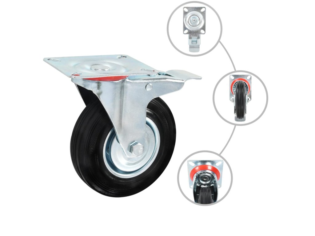 Kolečka jsou vyrobena z gumy, která je známá pro svou schopnost pohlcovat nárazy a vibrace. Ať už tedy kolečka namontujete na cokoliv, budete to moci přesouvat hladce a v tichosti. Jejich hladký povrch navíc ochrání vaši podlahu před poškrábáním. Zinkem potažený ocelový rám je odolný proti rzi, dodává kolečkům na odolnosti a prodlužuje jejich životnost. Tato otočná kolečka jsou vybavena dvojitou brzdou pro flexibilnější ovládání. Každé kolečko má maximální nosnost až 100 kg.