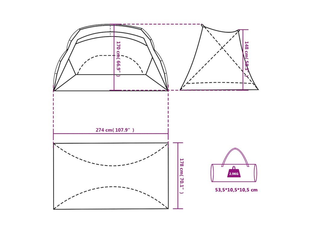 - Rozměry stanu: 274 x 178 x 170/148 cm (D x Š x V)