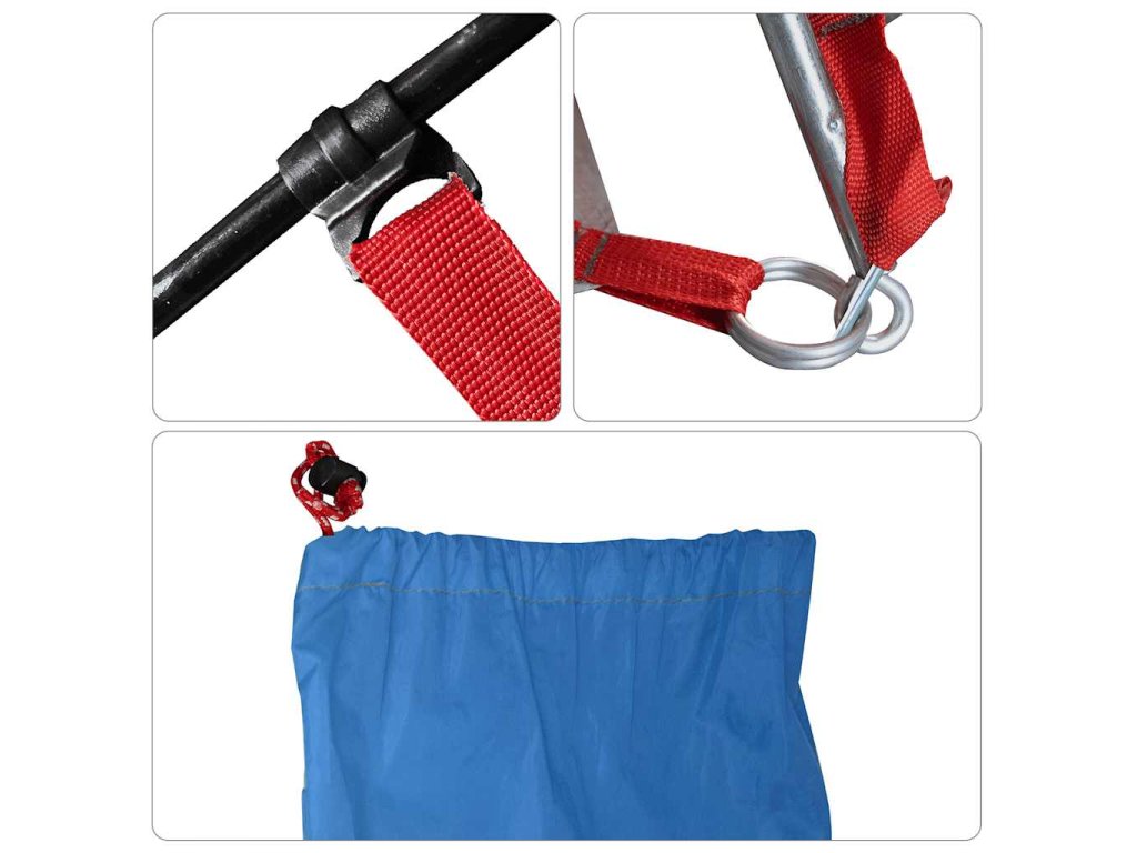- Pytlíky s pískem a kolíky pro větší stabilitu: Plážový stan má v každém rohu pytlík s pískem k zajištění stability. K dispozici jsou také další kolíky, které stan upevní a zabrání jeho odfouknutí.
