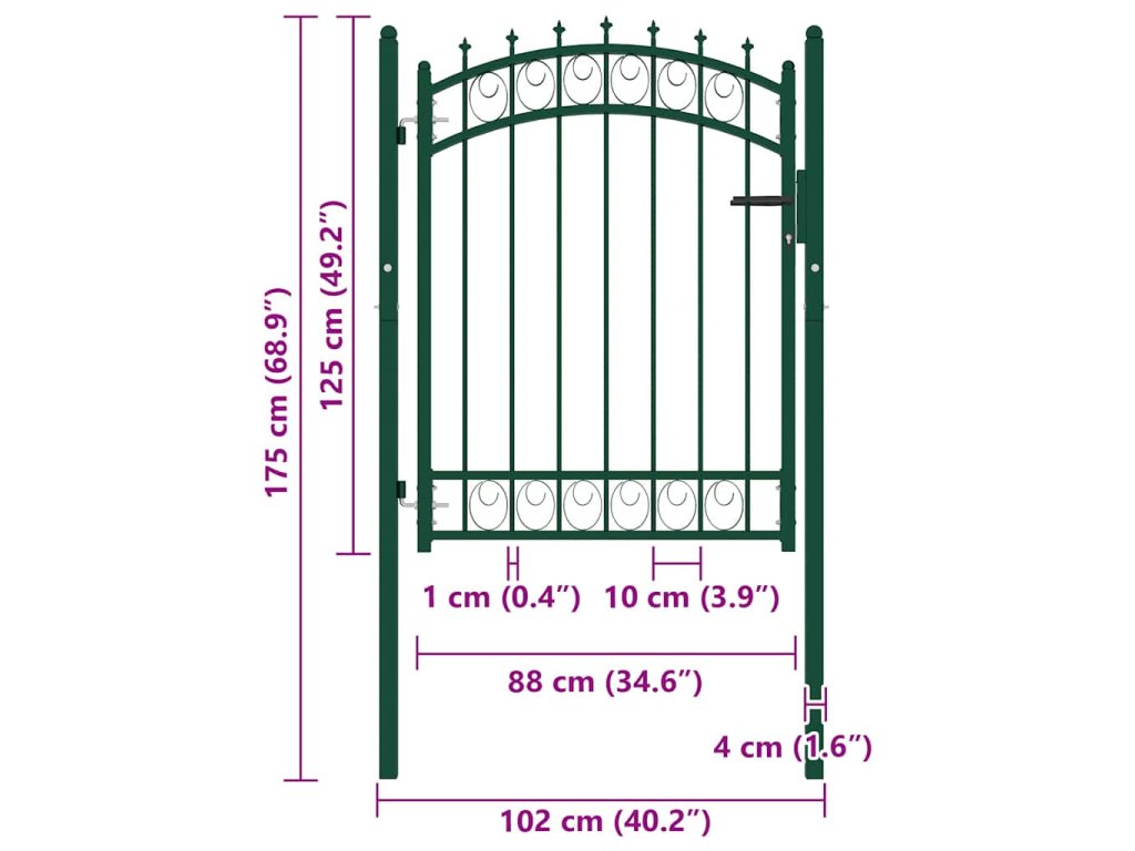 Plotová branka je vyrobená z vysoce odolné oceli, má robustní konstrukci s práškovým nástřikem proti rzi a korozi. Zahradní branka je vybavená vertikálním pruty zakončenými hroty a silnou vodorovnou výztuží, takže vám poskytne vysoký stupeň zabezpečení. Klenutý design jí dodává na eleganci. Součástí balení jsou dva pevné sloupky s robustními závěsy pro snadnou instalaci a také zámek se třemi klíči.
