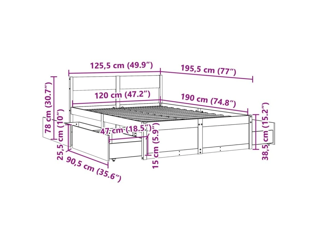 - Rozměry zásuvky pod postel: 90,5 x 47 x 25,5 cm (D x Š x V)
