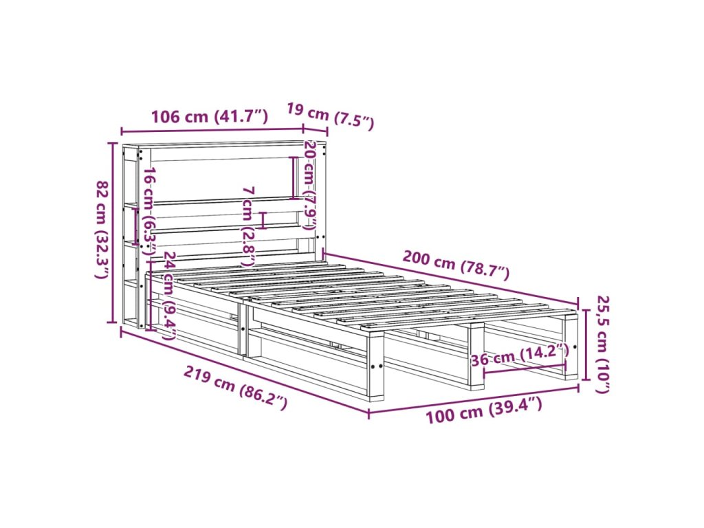 - Celkové rozměry postele: 219 x 106 x 82 cm (D x Š x V)