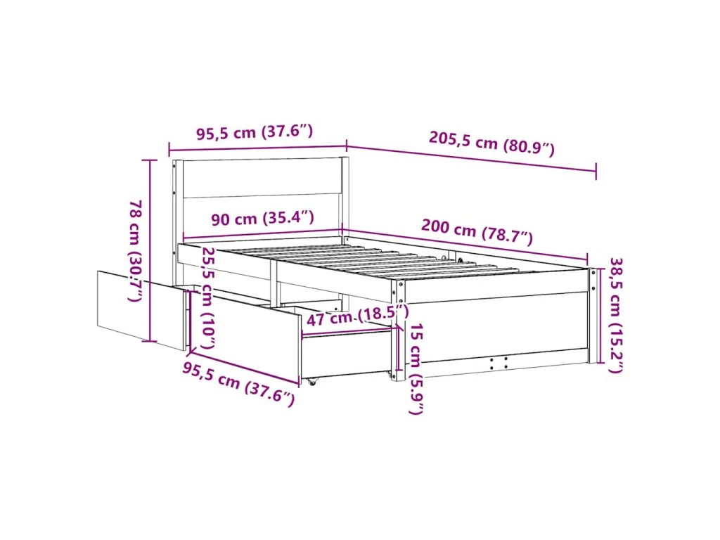 - Rozměry zásuvky pod postel: 95,5 x 47 x 25,5 cm (D x Š x V)