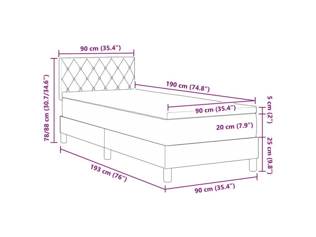 - Velikost matrace: Krátké jednolůžko (90 cm x 190 cm nebo 35" x 75")