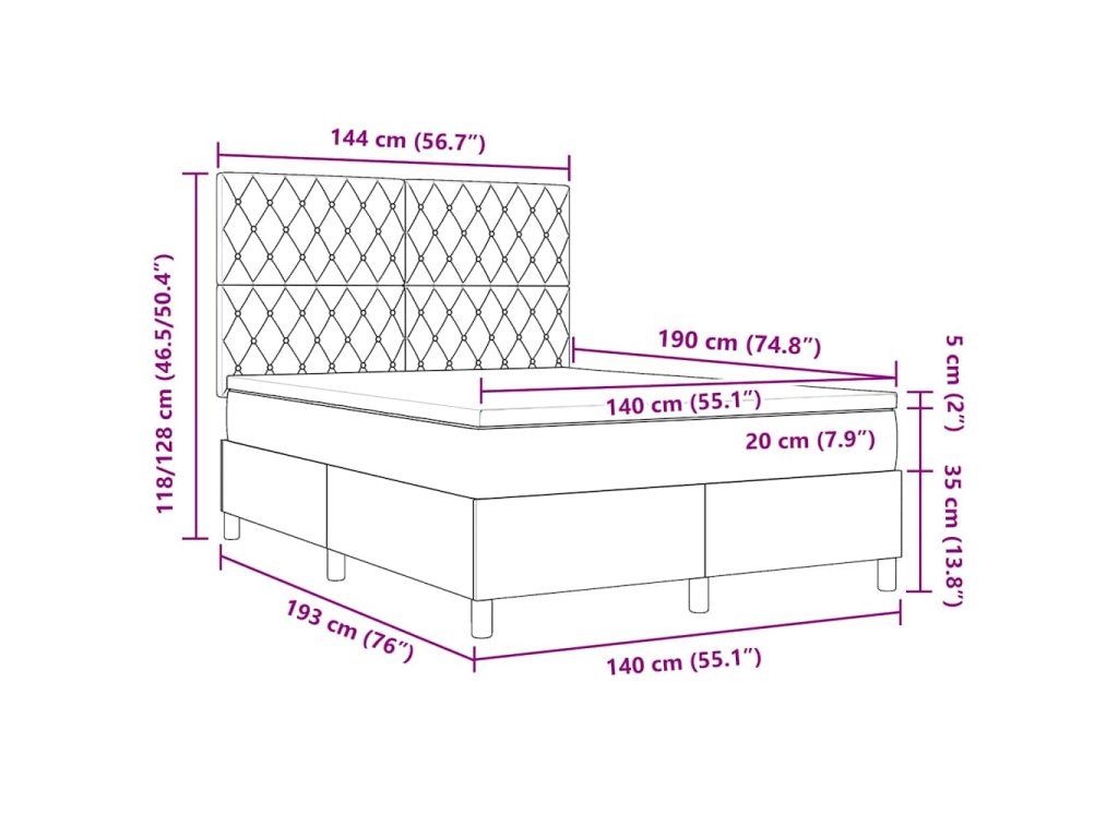 - Velikost matrace: Krátká dvojpostel (140 cm x 190 cm nebo 55" x 75")