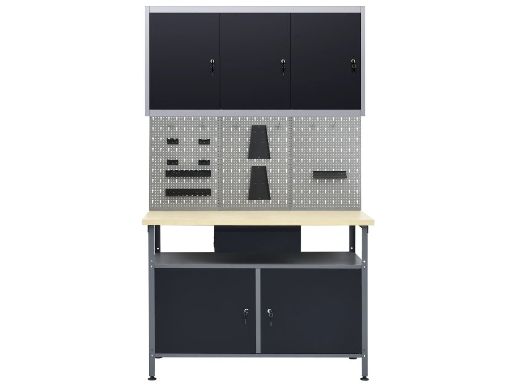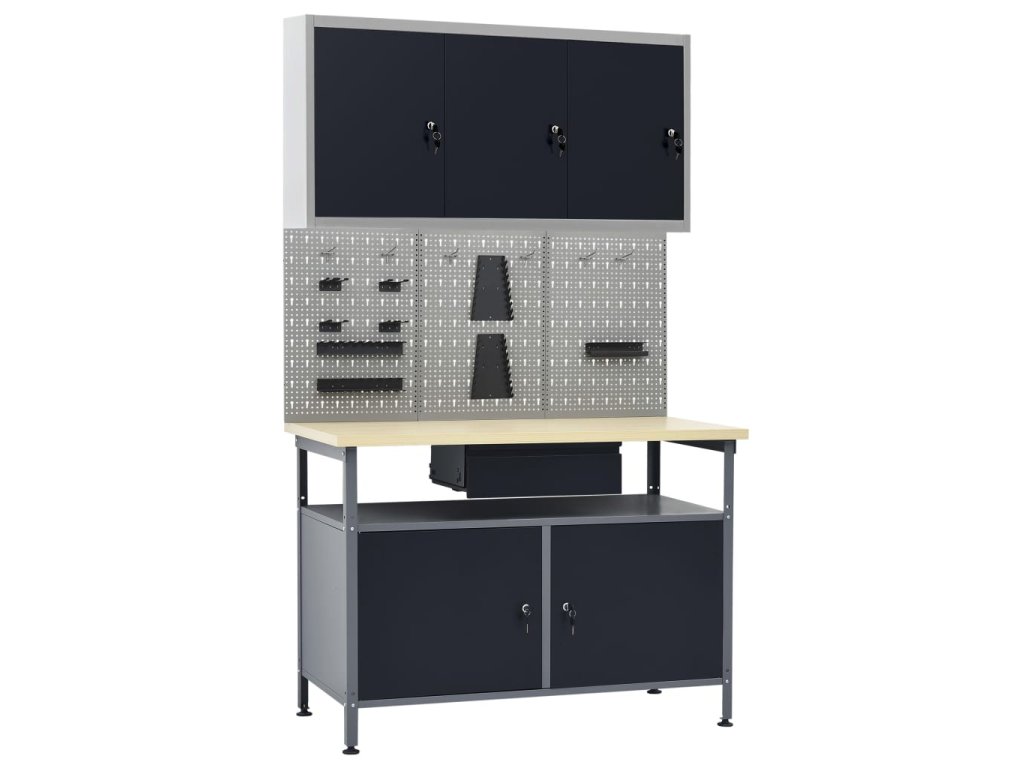 Tato dílenská sada 1 pracovního stolu se 3 nástěnnými panely a 1 nástěnnou skříňkou je praktické úložné řešení pro vaši dílnu a garáž.