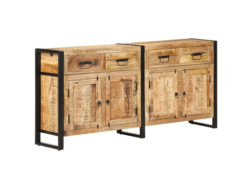 Tato úložná skříňka je zhotovená z masivního mangovníku, tropického tvrdého dřeva, které dokáže unést značnou váhu a skvěle odolává opotřebení i působení času. Každý kus se lehce odlišuje od všech ostatních svým unikátním zručným zpracováním a nádhernou kresbou dřeva. Práškově lakovaný ocelový rám zaručuje stabilitu a odolnost. Příborník má 2 přihrádky s dvířky a 4 zásuvky, najdete v něm tedy dostatek úložného prostoru pro vaše věci.