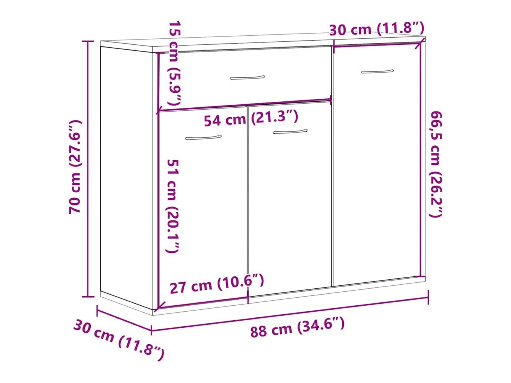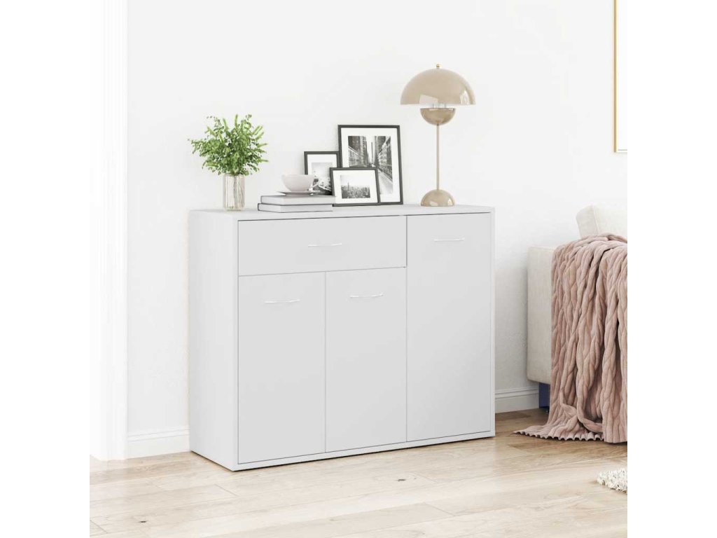 Příborník je vyroben z kvalitního kompozitního dřeva , a je tudíž mimořádně pevný a odolný. Najdete v něm 1 velkou zásuvku a 3 dvířka, které vám poskytnou spoustu místa na knihy, multimediální zařízení a jiné věci. Robustní horní deska je ideální pro vystavení dekorativních předmětů, zarámovaných fotografií nebo pokojových rostlin.