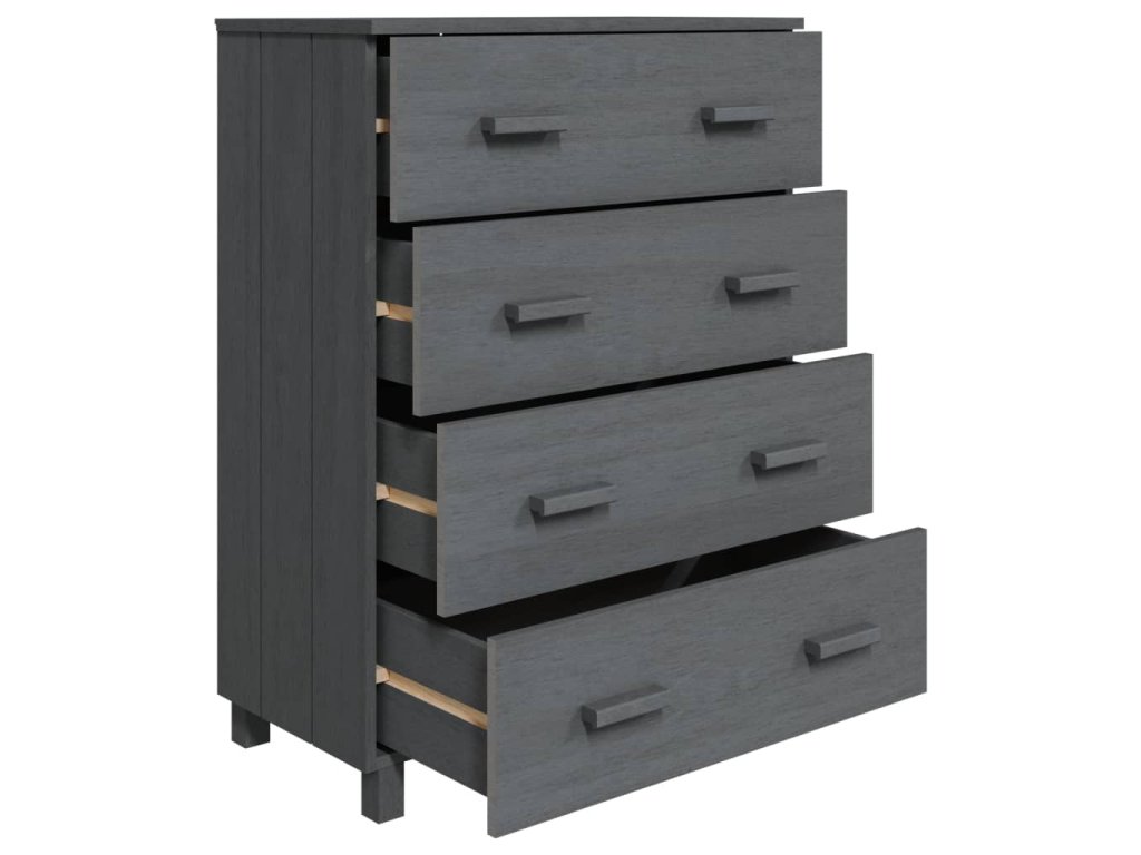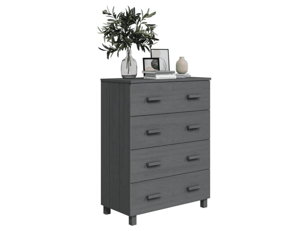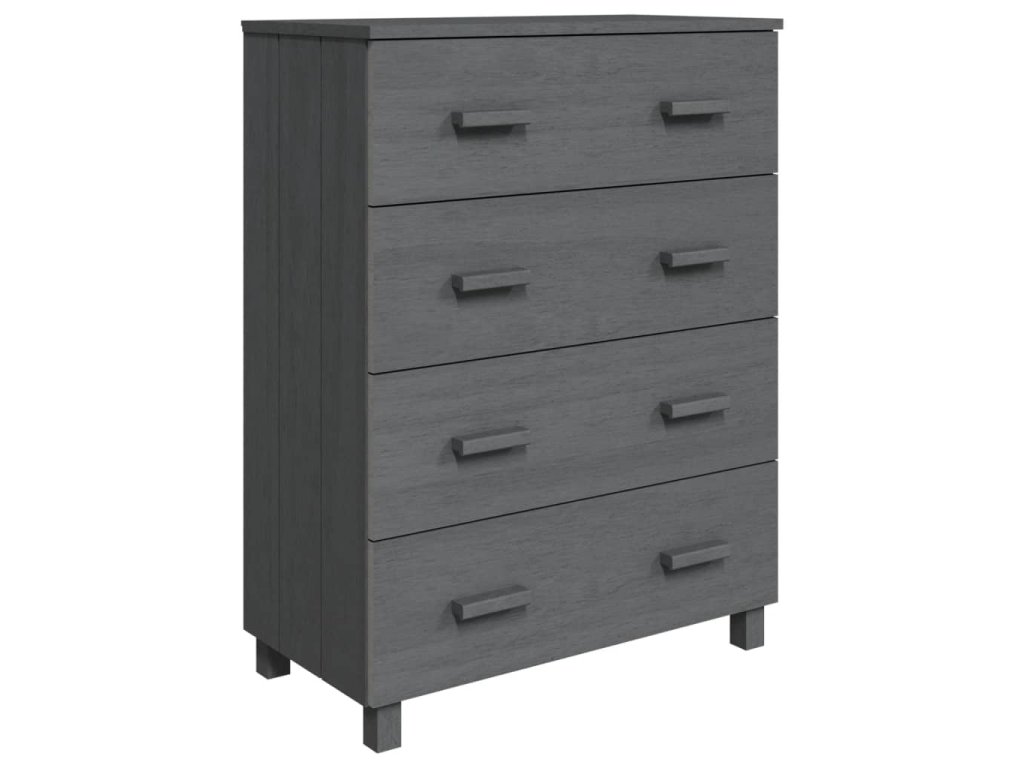 Skříňka se zásuvkami je zhotovena z masivního borového dřeva, je tedy bytelná a stabilní. Skříňka obsahuje 4 hladce výsuvné zásuvky, které poskytují dostatek prostoru pro přehledné uložení různých každodenních nezbytností, které tak budete mít pořád po ruce. Robustní horní deska je ideální pro vystavení dekorativních předmětů, fotorámečků nebo pokojových rostlin.