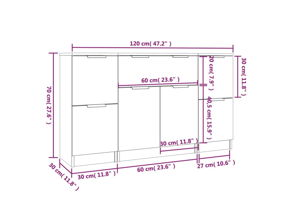 - Rozměry (příborník se zásuvkou): 60 x 30 x 70 cm (Š x H x V)