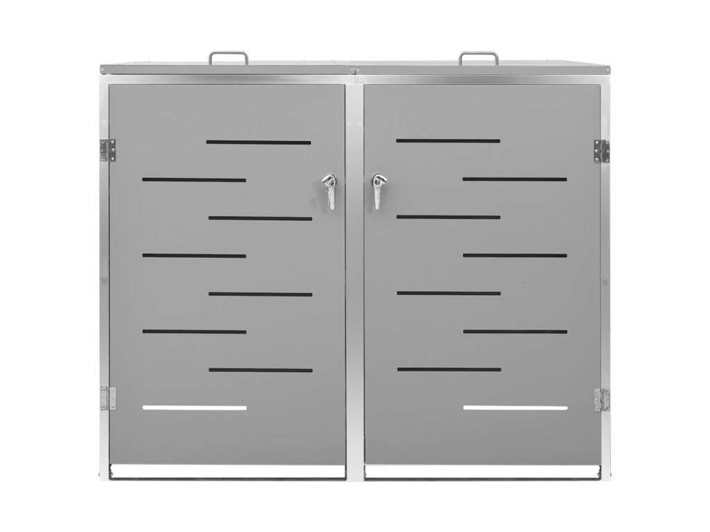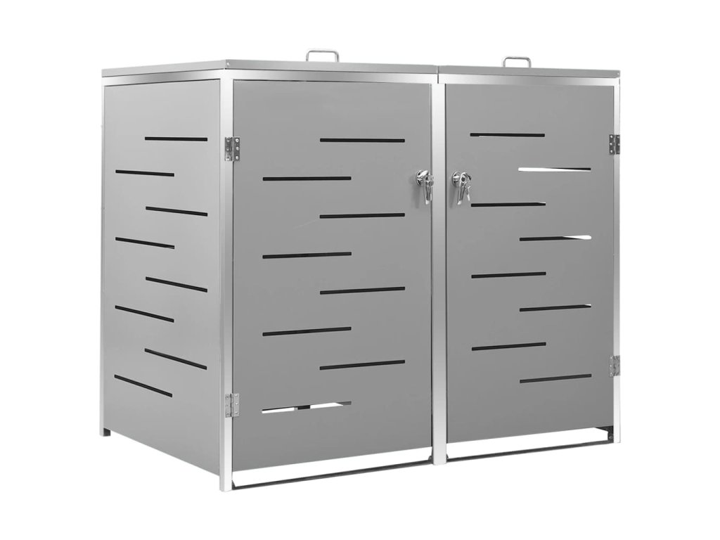 Tento přístřešek na popelnice je vyroben z pozinkovaného ocelového panelu a rámu z nerezové oceli, takže je mimořádně robustní a odolný proti korozi. Dutá konstrukce umožňuje cirkulaci vzduchu a zabraňuje, aby v popelnicích vznikal nepříjemný zápach. Uzamykací systém zároveň zajišťuje bezpečné uložení odpadků. Praktické víko a pružiny navíc usnadňují vkládání a vyjímání popelnic.
