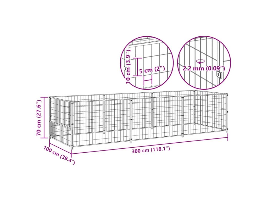 Velká klec pro psy poskytuje spoustu prostoru pro pohyb psa. Stěny z ocelového pletiva pomáhají předcházet nečekaným nehodám a zároveň umožňují volné proudění vzduchu. Výběh má robustní ocelovou konstrukci, je proto odolný a má dlouhou životnost. Dveře jsou navíc opatřeny uzamykatelnou západkou, která zajišťuje větší bezpečnost a ochranu vašich psů.