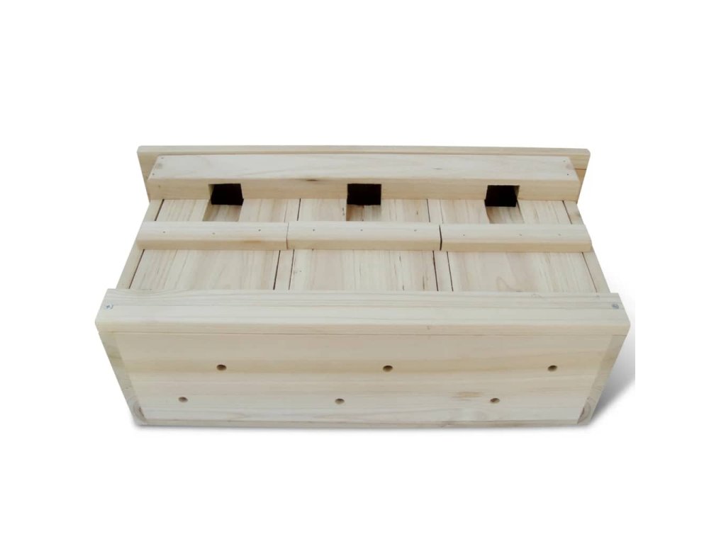 Vnější strana má přírodní dřevěnou barvu, bude tak nejen teplým a bezpečným domovem pro ptáky, ale také skvělou dekorací vaší zahrady. Budka má 3 komory, mohou se v ní tedy ubytovat 3 ptačí páry a vychovávat v nich své potomky. Každá komora má odnímatelná přední dvířka pro snazší čištění. Budka je vybavená kovovými háky, můžete ji tedy rovnou připevnit na vaší zahradě.