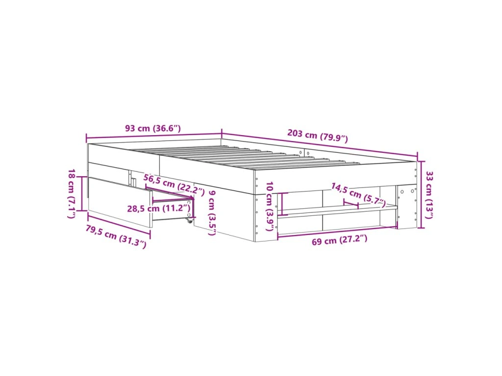 - Úložný prostor: Tento rám postele nabízí zásuvky a otevřené přihrádky pro uložení časopisů, knih, hraček a dalších drobných předmětů.