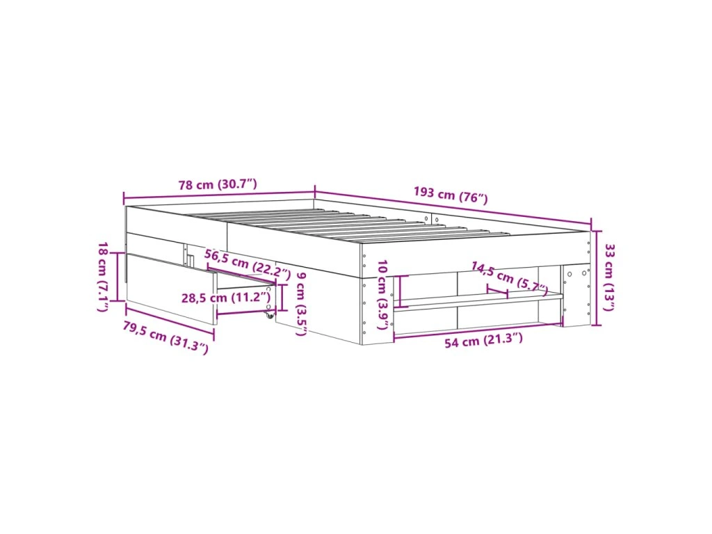 - Úložný prostor: Tento rám postele nabízí zásuvky a otevřené přihrádky pro uložení časopisů, knih, hraček a dalších drobných předmětů.