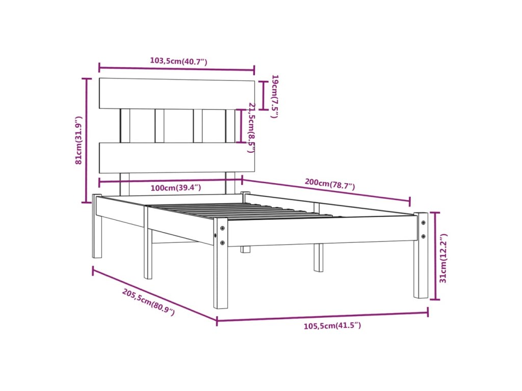 - Rozměry rámu postele: 205,5 x 105,5 x 31 cm (D x Š x V)