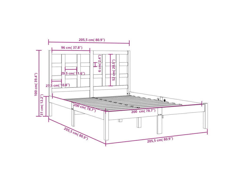 - Rozměry rámu postele: 205,5 x 205,5 x 31 cm (D x Š x V)