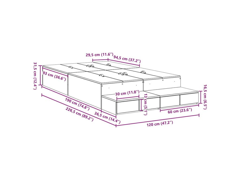 - Celkové rozměry: 226,5 x 120 x 31,5 cm (D x Š x V)