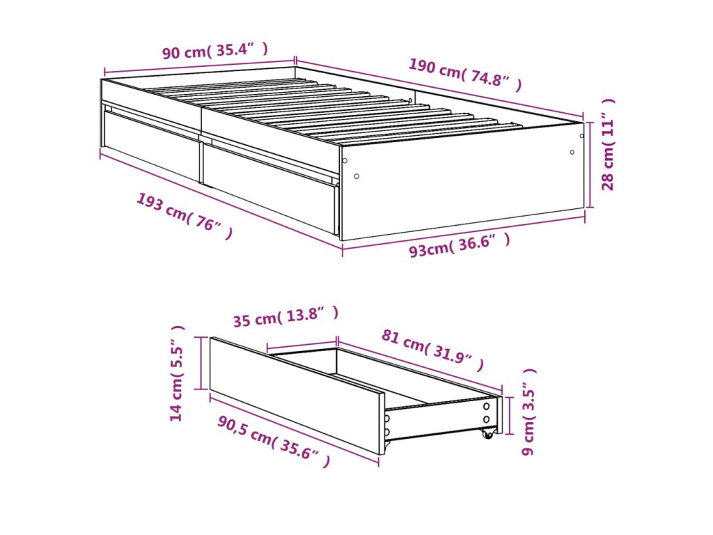Rám postele se zásuvkami hnědý dub 90 x 190 cm kompozitní dřevo 3280712