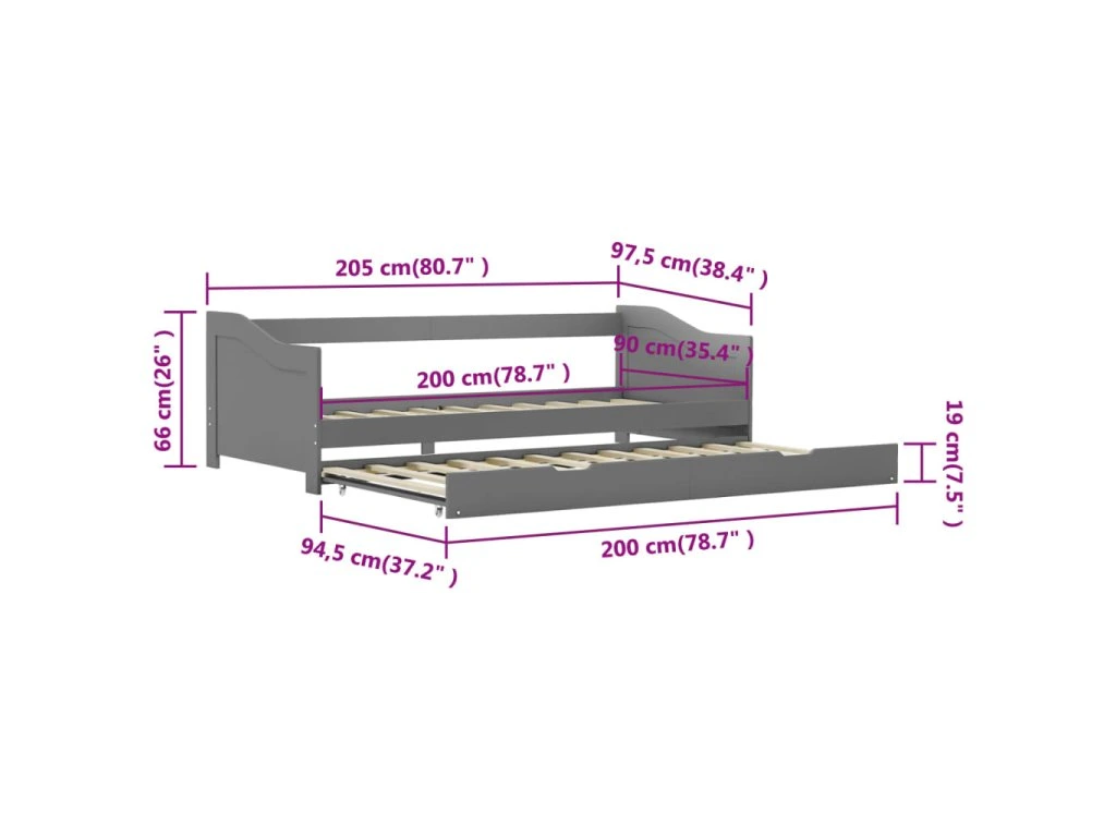 Rám vysouvací postele/pohovky šedý borové dřevo 90 x 200 cm 283151