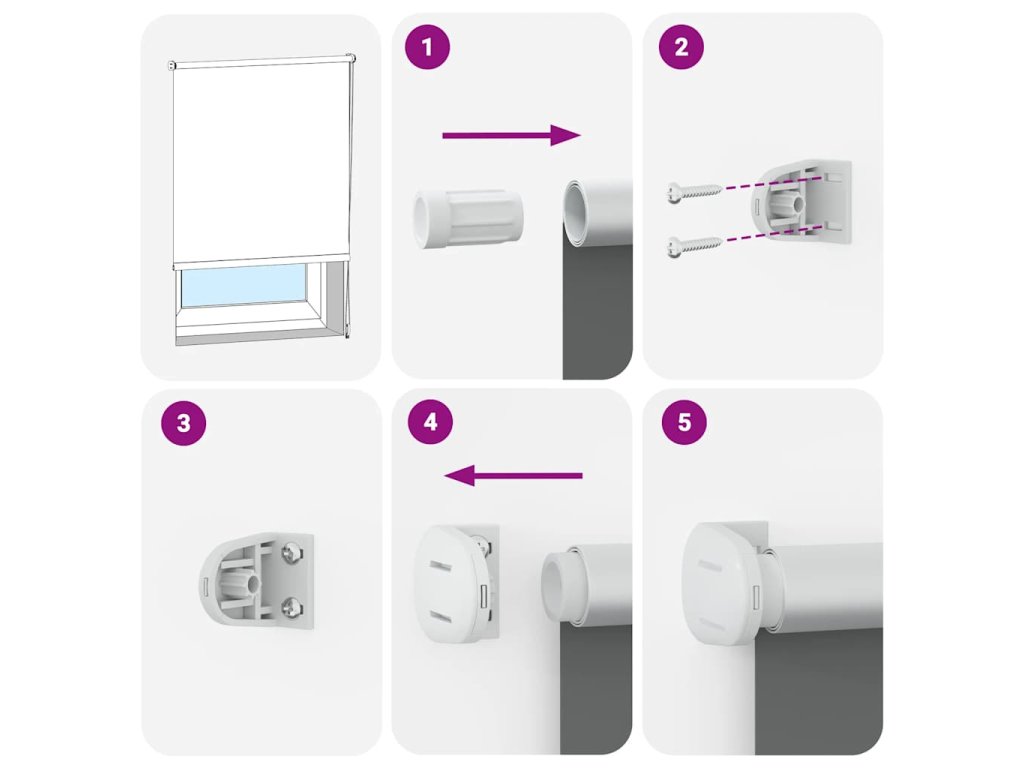 - Více způsobů montáže: V závislosti na vašich potřebách můžete roletu připevnit na stěnu nebo okno pomocí šroubů nebo bez vrtání pomocí upínacích konzol. Upínací držáky pro tloušťku falcu okenního rámu od 1,6 do 2,5 cm.