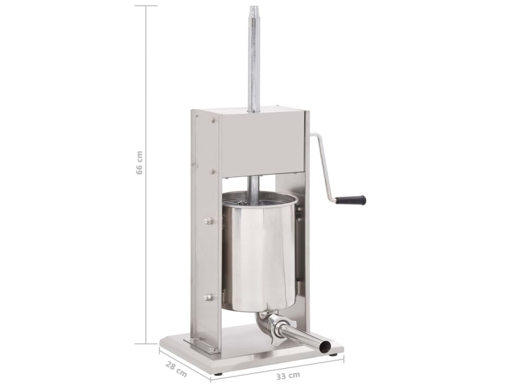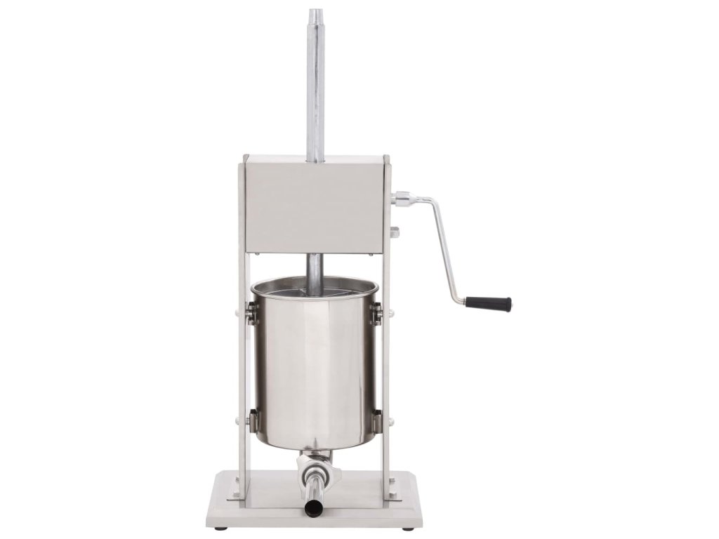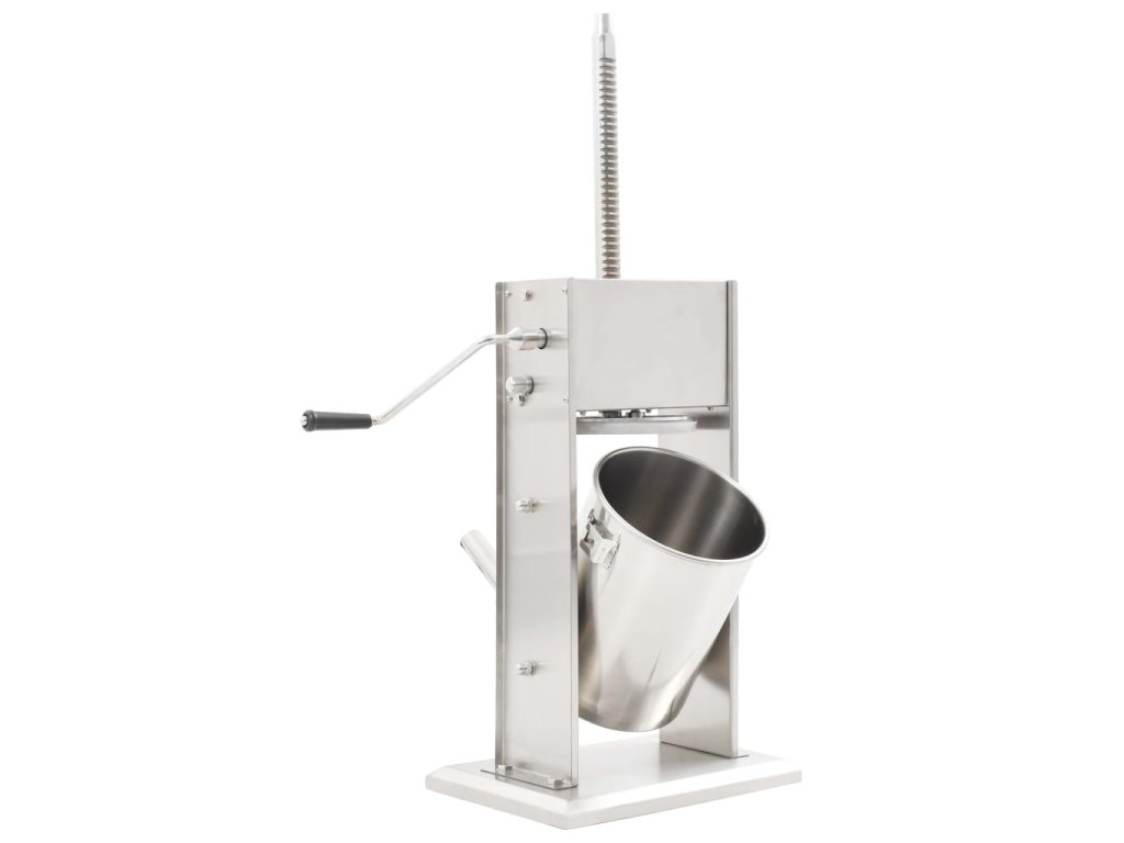 Tato nerezová plnička klobás je vybavená 10litrovým zásobníkem, který lze vyklopit či vyjmout pro pohodlnější plnění masem nebo čištění. Ruční klika pohybuje pístem, který protlačí maso skrz plnicí nástavec. Součástí balení jsou také 3 plnicí nástavce v různých velikostech pro uspokojení vašich nejrůznějších potřeb.