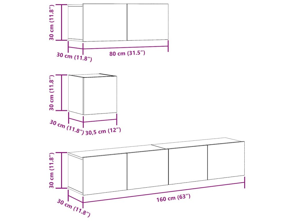 - Rozměry TV skříňky (velká): 80 x 30 x 30 cm (D x Š x V)