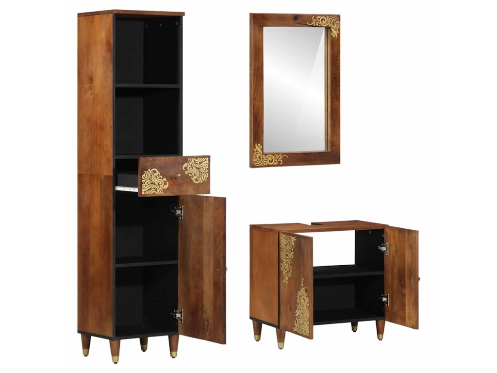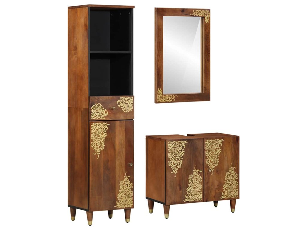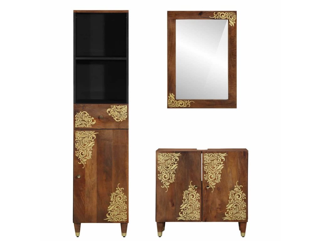 Tento Dřevěný koupelnový skříňkový set spojuje funkčnost s hezkým rustikálním designem, ideálním pro ty, co mají rádi krásné a praktické kousky v bytě. Vyroben z pevného mangového dřeva, tahle sada přináší přírodní tóny a dotek luxusu díky zlatému potisku. Je to univerzální výběr, který se hodí do různých stylů koupelen, zajišťuje potřebný úložný prostor a zlepšuje vzhled místnosti. Skvělá volba pro majitele, co chtějí mít pokoje uklizené a zároveň stylové.