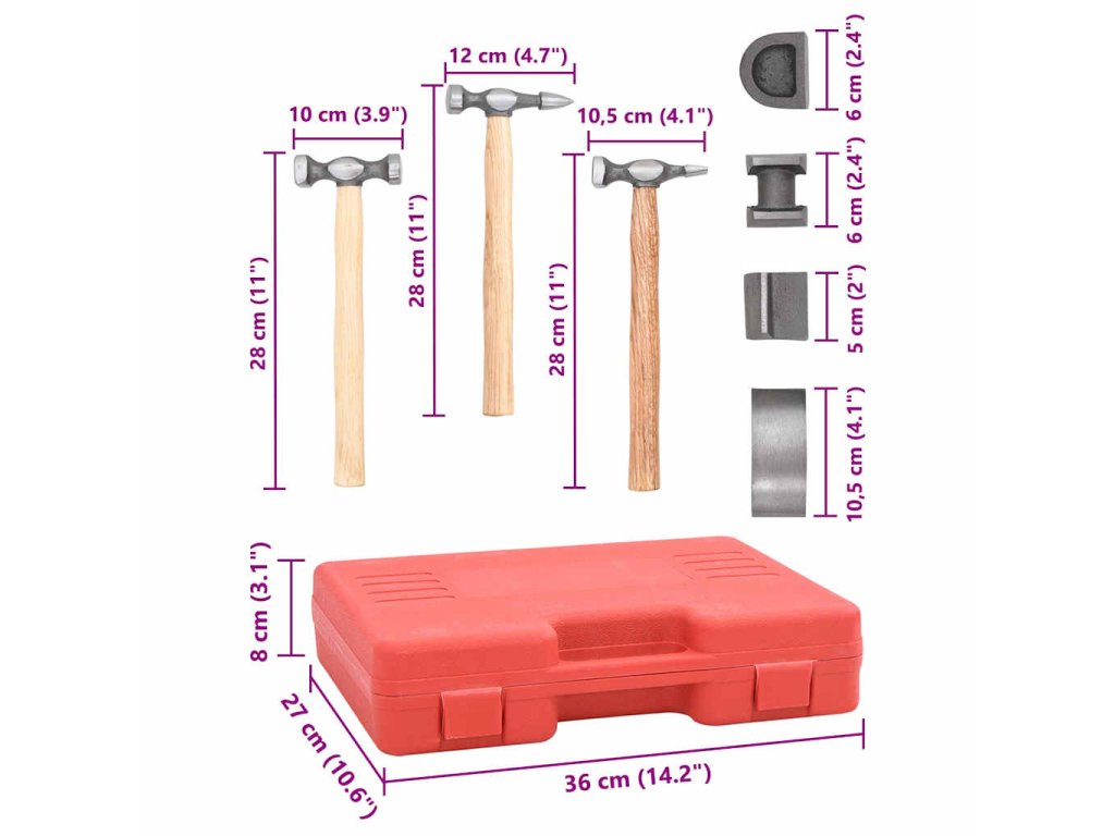 Balení obsahuje 1 x karosářské kladivo, kladivo ploché, 1 x kladivo špičaté, 1 x víceúčelová babka, 1 x vypouklá babka, 1 x autokarosářská lžíce, 1 x kovadlina a 1 x červené pouzdro z foukaného plastu.
