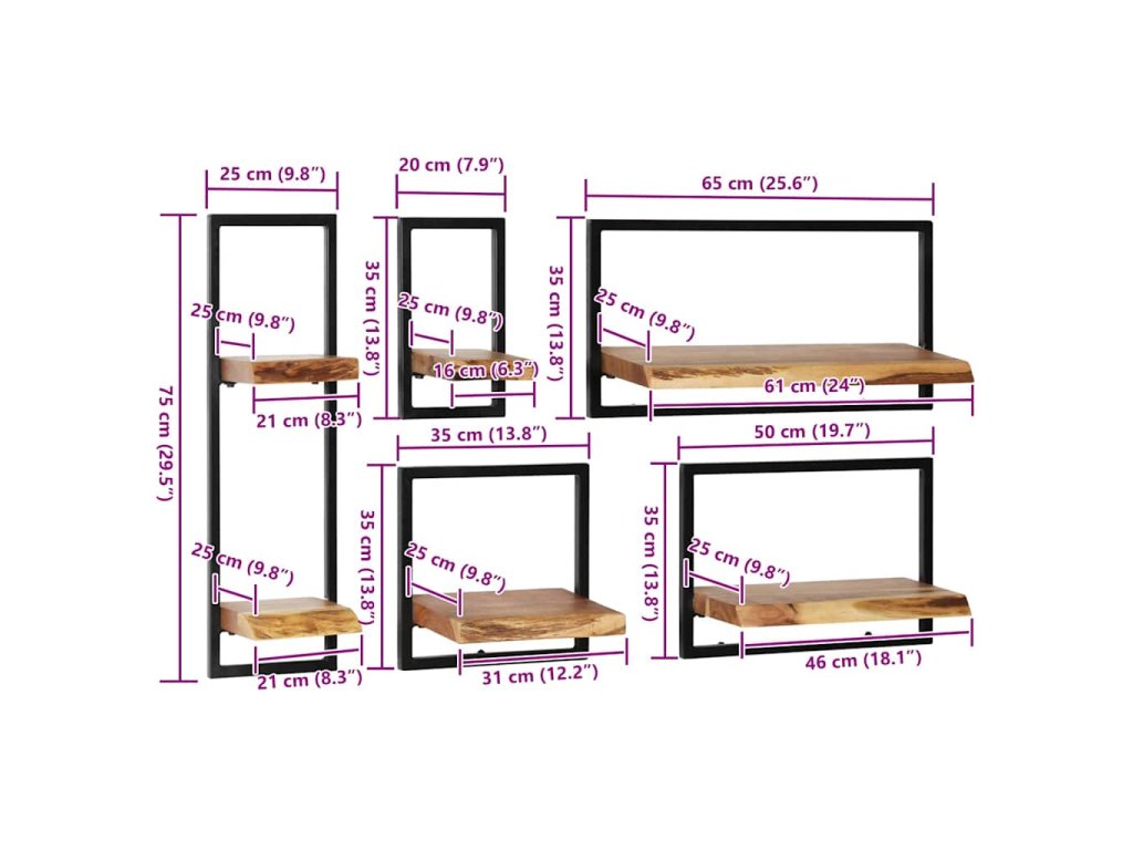 Tato sada nástěnných polic sestává z 5 poliček různých velikostí, které svým retro designem promění každou prázdnou zeď v dekorativní záležitost. Police z masivního dřeva se výborně hodí k vystavování nejrůznějších věcí, jako jsou knížky, ocenění, sběratelské předměty, ozdoby apod.