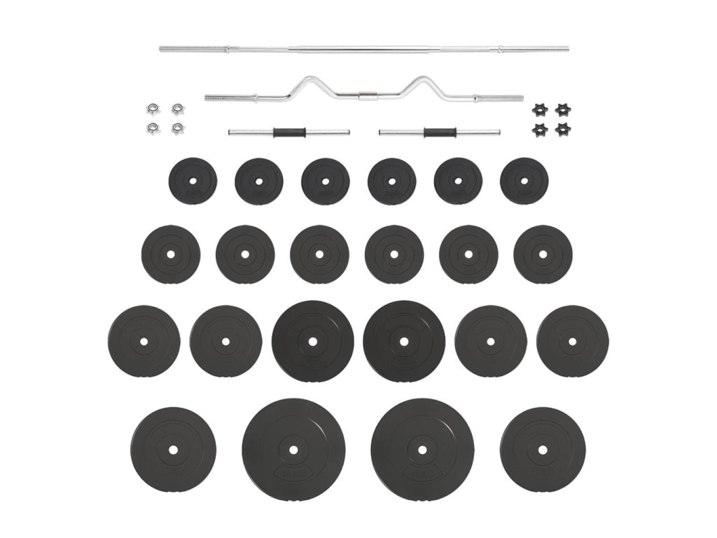 - Hmotnost kotoučů: 2x 7,5 kg, 6x 2,5 kg, 6x 1,25 kg, 4x 5 kg, 2x 15 kg, 2x 10 kg