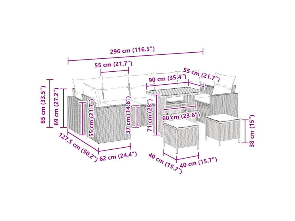 - Součásti balení: Set zahrnuje čtyři pohovky s područkami, tři středové sezení, dvě stoličky a univerzální stůl, což skvěle pokrývá potřeby pro sezení a odpočinek. Skvělý design umožňuje různé uspořádání, ať už jde o intimní setkání nebo větší akce.