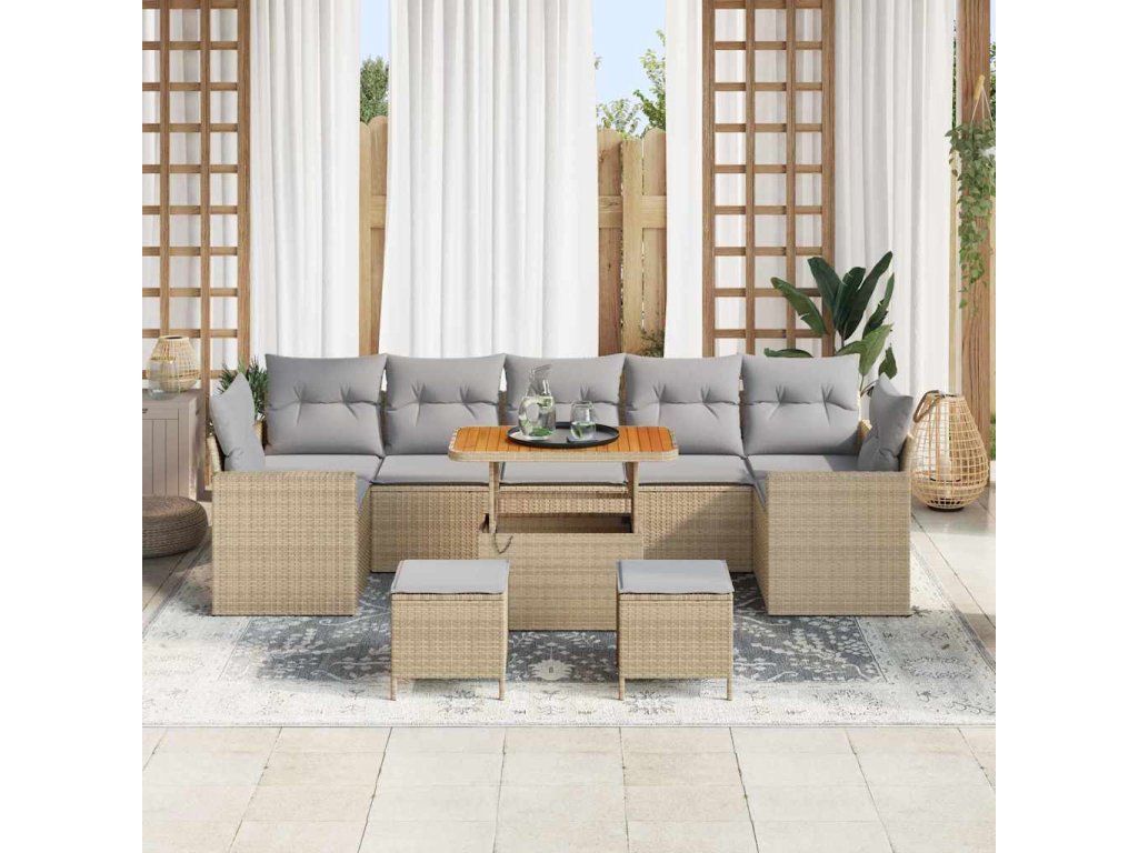 - Materiály: Rafinované poly ratan a masivní akáciové dřevo zajišťují současný vzhled a trvanlivost. Poly ratan skvěle odolává UV záření, takže si i po sezonách uchová svůj vzhled. Akáciové dřevo dodává příjemnou texturu, což celému setu přidává šmrnc.