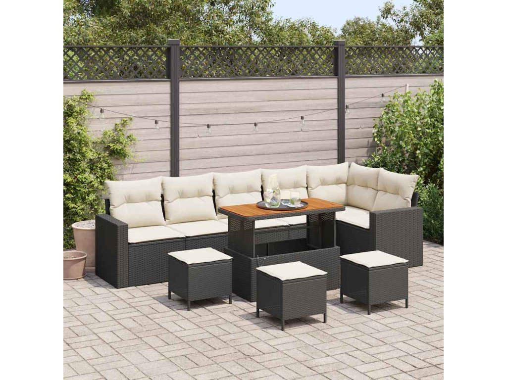 - Materiály: Tato zahradní sedací souprava je převážně z poly ratanu, což jí dodává šik vzhled, který se hodí k jakékoli venkovní výzdobě. Pevné akáciové dřevo přidává přírodní eleganci. Oba materiály jsou odolné vůči povětrnostním vlivům, takže máte spolehlivé a atraktivní sezení.