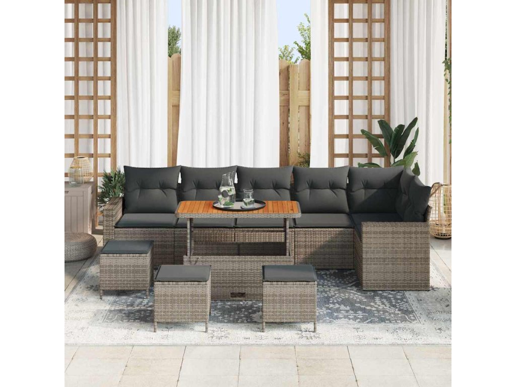 - Materiály: Tato zahradní sedací souprava je převážně z poly ratanu, což jí dodává šik vzhled, který se hodí k jakékoli venkovní výzdobě. Pevné akáciové dřevo přidává přírodní eleganci. Oba materiály jsou odolné vůči povětrnostním vlivům, takže máte spolehlivé a atraktivní sezení.